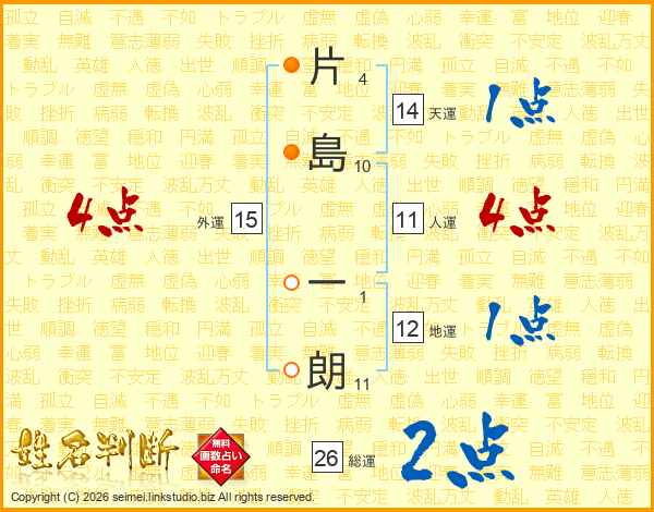 片(4画)島(10画) 一(1画)朗(11画)