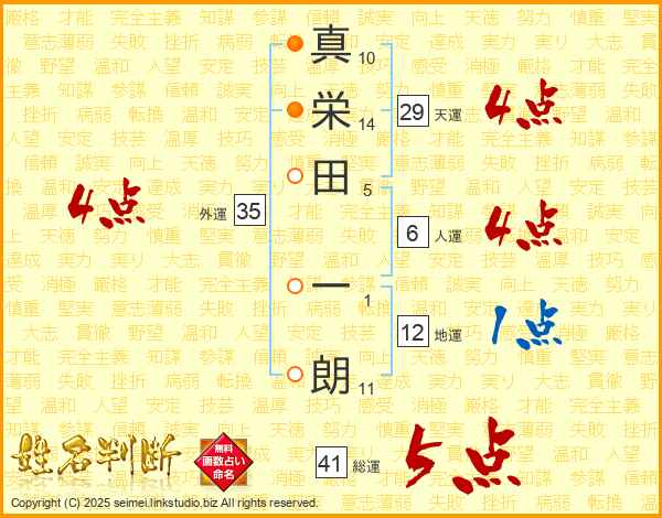 真(10画)栄(14画)田(5画) 一(1画)朗(11画)