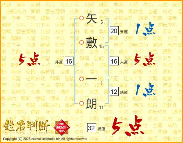 矢(5画)敷(15画) 一(1画)朗(11画)