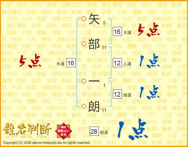 あなたの人生を表す1番重要な運勢です。生涯を通じて影響する総合運となり、主に50歳以降の晩年期に影響を及ぼします。苗字と名前の合計画数。