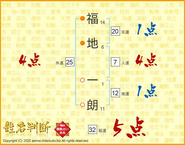 生活面を象徴する運勢です。外部から受ける影響力を表し、結婚運、家庭運や職場、環境への順応性を表します。総運から人運を引いた画数。姓や名が1文字の場合を除く。