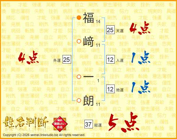 福(14画)﨑(11画) 一(1画)朗(11画)