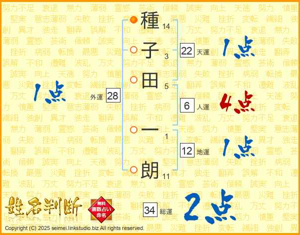 種(14画)子(3画)田(5画) 一(1画)朗(11画)