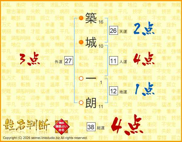 生活面を象徴する運勢です。外部から受ける影響力を表し、結婚運、家庭運や職場、環境への順応性を表します。総運から人運を引いた画数。姓や名が1文字の場合を除く。