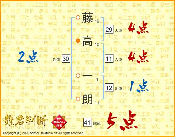 藤(19画)高(10画) 一(1画)朗(11画)