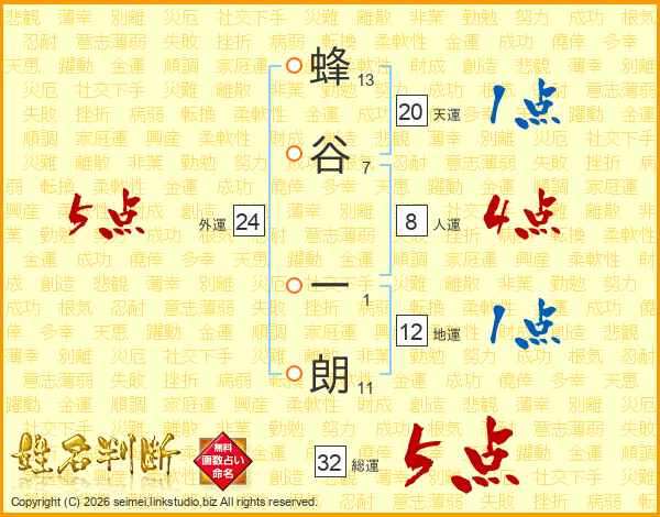 生活面を象徴する運勢です。外部から受ける影響力を表し、結婚運、家庭運や職場、環境への順応性を表します。総運から人運を引いた画数。姓や名が1文字の場合を除く。