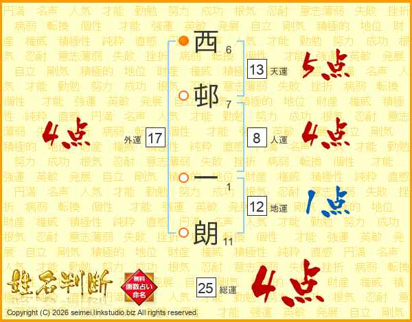 生活面を象徴する運勢です。外部から受ける影響力を表し、結婚運、家庭運や職場、環境への順応性を表します。総運から人運を引いた画数。姓や名が1文字の場合を除く。
