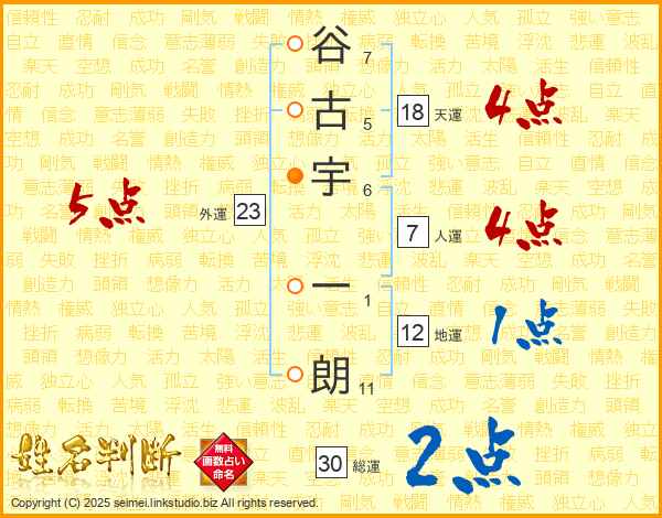 谷(7画)古(5画)宇(6画) 一(1画)朗(11画)