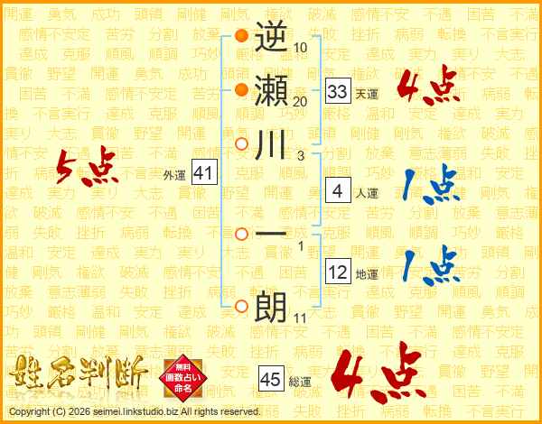 逆(10画)瀬(20画)川(3画) 一(1画)朗(11画)