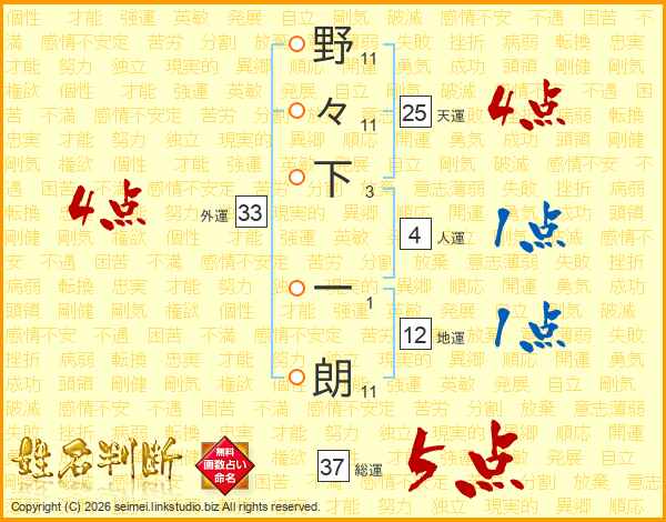 野(11画)々(11画)下(3画) 一(1画)朗(11画)