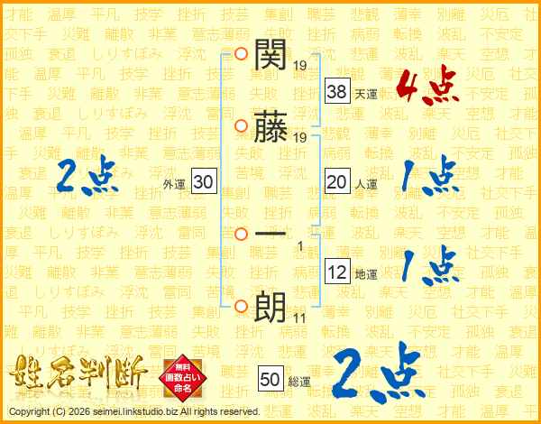 生活面を象徴する運勢です。外部から受ける影響力を表し、結婚運、家庭運や職場、環境への順応性を表します。総運から人運を引いた画数。姓や名が1文字の場合を除く。