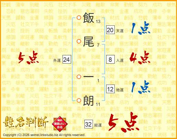 飯(13画)尾(7画) 一(1画)朗(11画)
