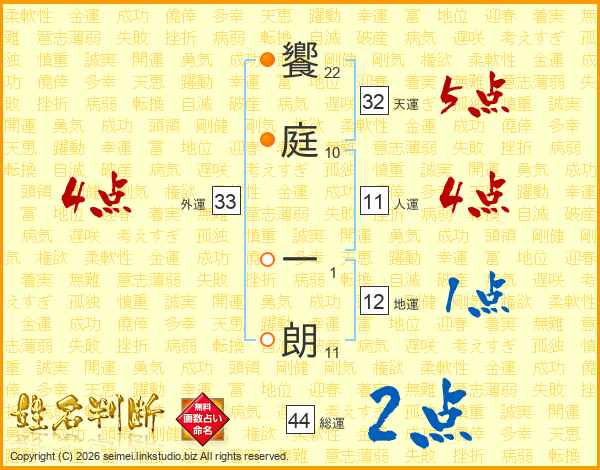 生活面を象徴する運勢です。外部から受ける影響力を表し、結婚運、家庭運や職場、環境への順応性を表します。総運から人運を引いた画数。姓や名が1文字の場合を除く。