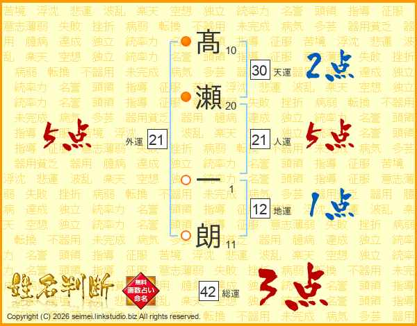 髙瀬一朗さんの人運は21画の5点!