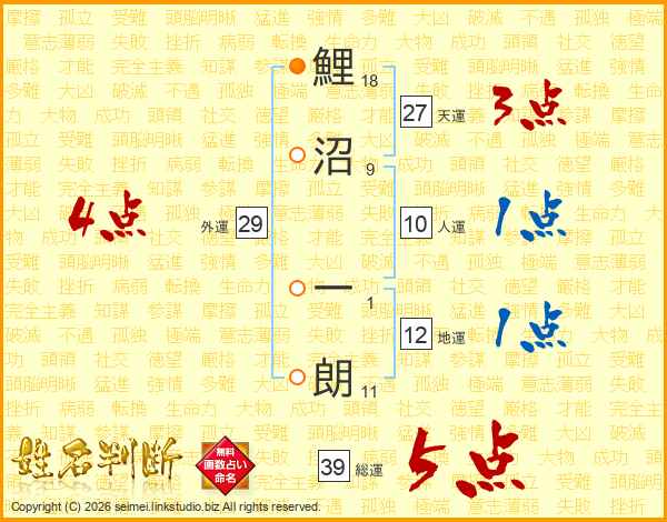 鯉(18画)沼(9画) 一(1画)朗(11画)