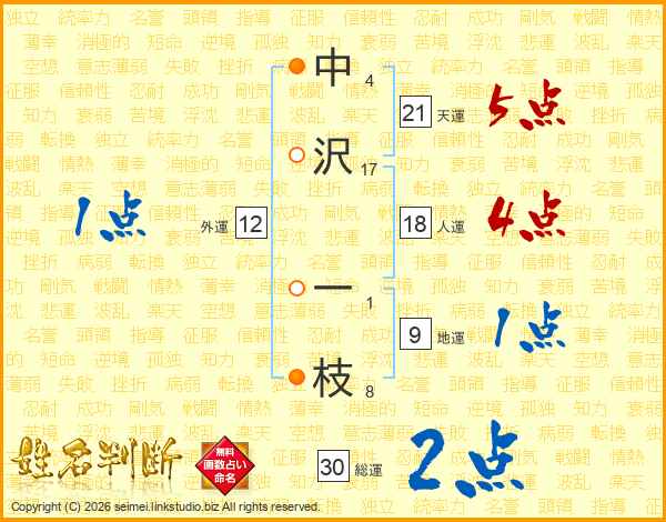 生活面を象徴する運勢です。外部から受ける影響力を表し、結婚運、家庭運や職場、環境への順応性を表します。総運から人運を引いた画数。姓や名が1文字の場合を除く。