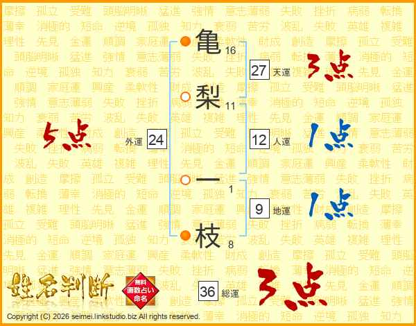 亀(16画)梨(11画) 一(1画)枝(8画)