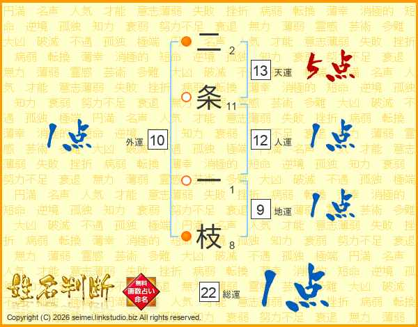 画数の奇数(○陽)と偶数(●陰)の配列で吉凶を占います。どちらかにかたよる名前は大凶名で避ける必要があります。画数の奇数偶数。