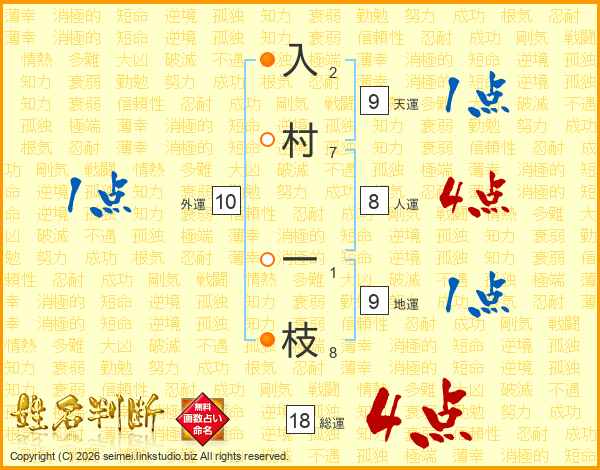 生活面を象徴する運勢です。外部から受ける影響力を表し、結婚運、家庭運や職場、環境への順応性を表します。総運から人運を引いた画数。姓や名が1文字の場合を除く。