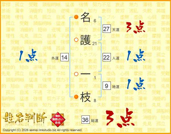 生活面を象徴する運勢です。外部から受ける影響力を表し、結婚運、家庭運や職場、環境への順応性を表します。総運から人運を引いた画数。姓や名が1文字の場合を除く。