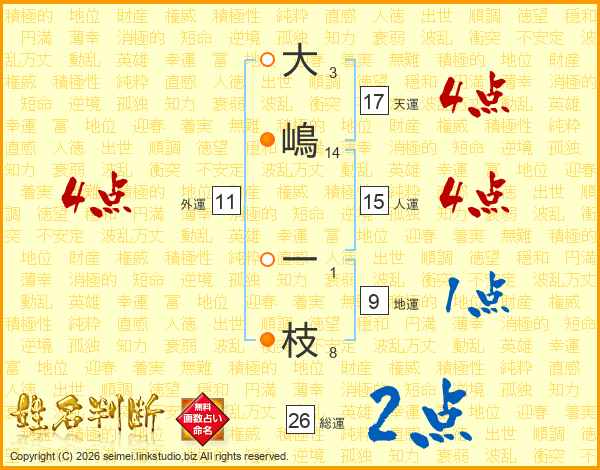 大(3画)嶋(14画) 一(1画)枝(8画)