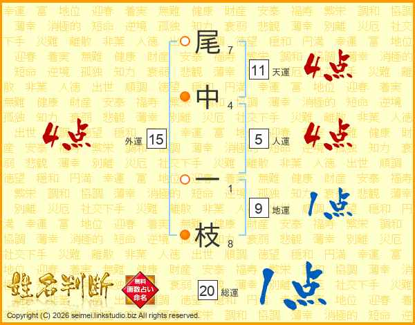 生活面を象徴する運勢です。外部から受ける影響力を表し、結婚運、家庭運や職場、環境への順応性を表します。総運から人運を引いた画数。姓や名が1文字の場合を除く。