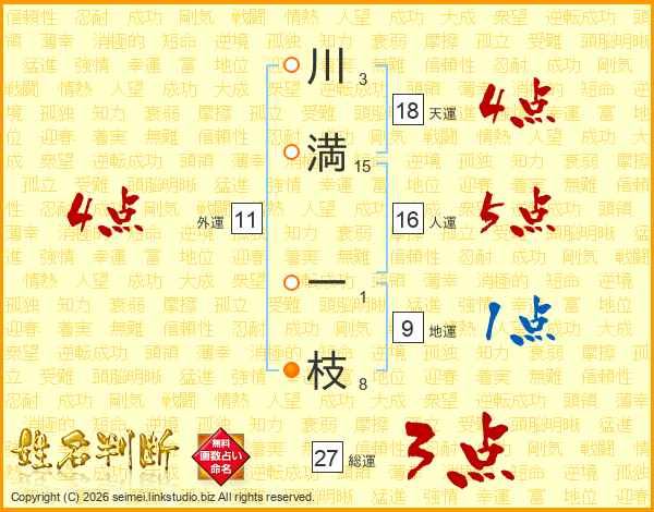 あなたの人生を表す1番重要な運勢です。生涯を通じて影響する総合運となり、主に50歳以降の晩年期に影響を及ぼします。苗字と名前の合計画数。