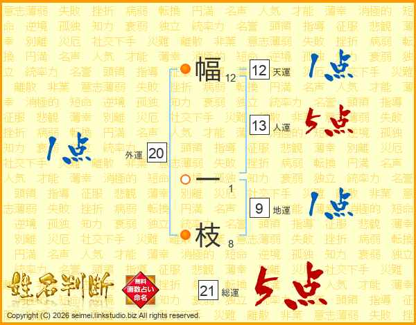 生活面を象徴する運勢です。外部から受ける影響力を表し、結婚運、家庭運や職場、環境への順応性を表します。総運から人運を引いた画数。姓や名が1文字の場合を除く。