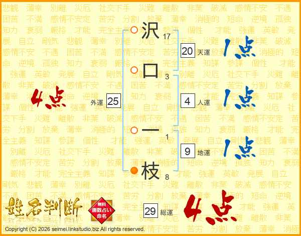 生活面を象徴する運勢です。外部から受ける影響力を表し、結婚運、家庭運や職場、環境への順応性を表します。総運から人運を引いた画数。姓や名が1文字の場合を除く。