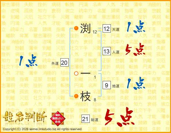 あなたの人生を表す1番重要な運勢です。生涯を通じて影響する総合運となり、主に50歳以降の晩年期に影響を及ぼします。苗字と名前の合計画数。