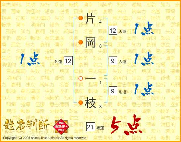 生活面を象徴する運勢です。外部から受ける影響力を表し、結婚運、家庭運や職場、環境への順応性を表します。総運から人運を引いた画数。姓や名が1文字の場合を除く。