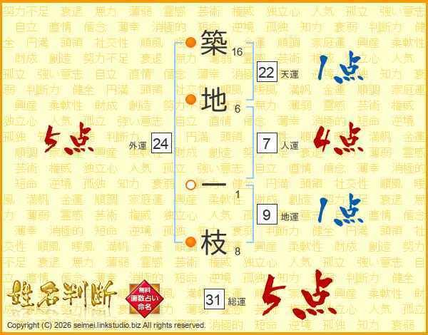 築(16画)地(6画) 一(1画)枝(8画)