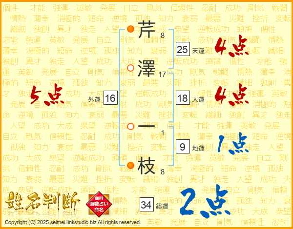 芹(8画)澤(17画) 一(1画)枝(8画)