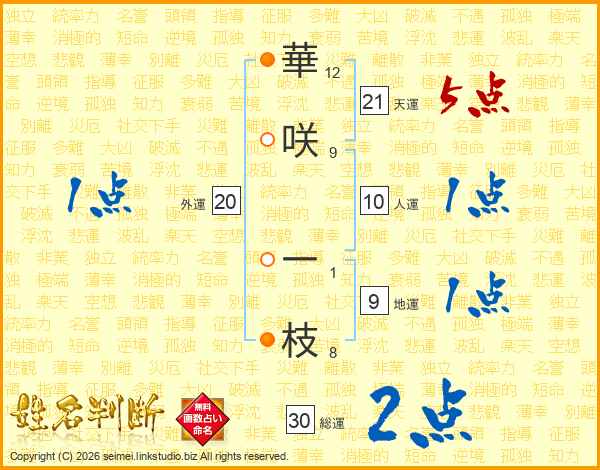 華(12画)咲(9画) 一(1画)枝(8画)
