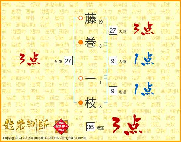 藤(19画)巻(8画) 一(1画)枝(8画)