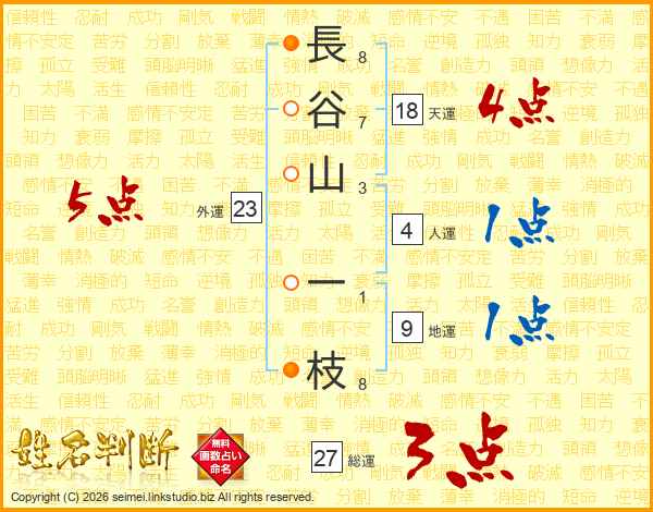 長(8画)谷(7画)山(3画) 一(1画)枝(8画)