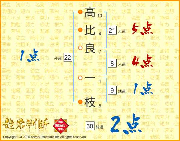 高(10画)比(4画)良(7画) 一(1画)枝(8画)