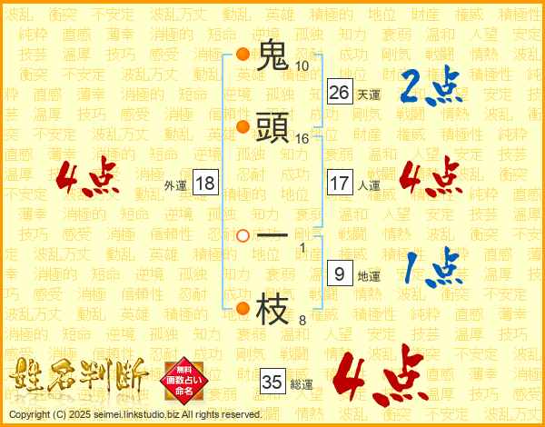 鬼(10画)頭(16画) 一(1画)枝(8画)
