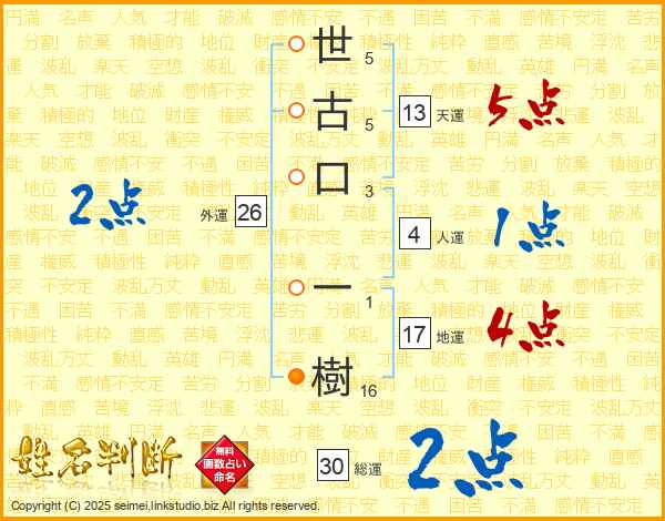 世(5画)古(5画)口(3画) 一(1画)樹(16画)