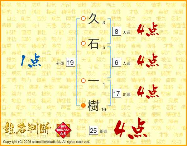 生活面を象徴する運勢です。外部から受ける影響力を表し、結婚運、家庭運や職場、環境への順応性を表します。総運から人運を引いた画数。姓や名が1文字の場合を除く。