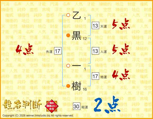 乙(1画)黒(12画) 一(1画)樹(16画)