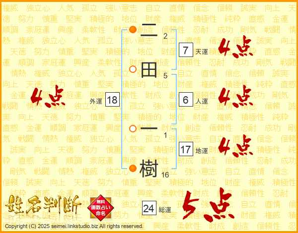 生活面を象徴する運勢です。外部から受ける影響力を表し、結婚運、家庭運や職場、環境への順応性を表します。総運から人運を引いた画数。姓や名が1文字の場合を除く。