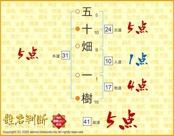 家系が持つ宿命的な運勢を表します。祖先から受け継いだ苗字ですので自分の力が及びません。家柄を象徴します。苗字の合計画数。