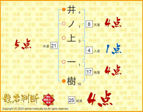 生活面を象徴する運勢です。外部から受ける影響力を表し、結婚運、家庭運や職場、環境への順応性を表します。総運から人運を引いた画数。姓や名が1文字の場合を除く。