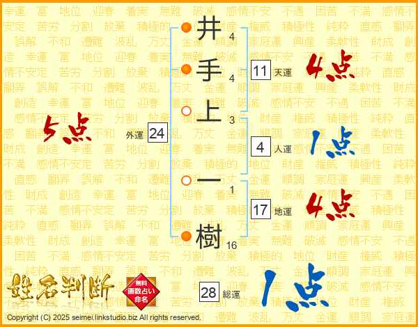 生活面を象徴する運勢です。外部から受ける影響力を表し、結婚運、家庭運や職場、環境への順応性を表します。総運から人運を引いた画数。姓や名が1文字の場合を除く。