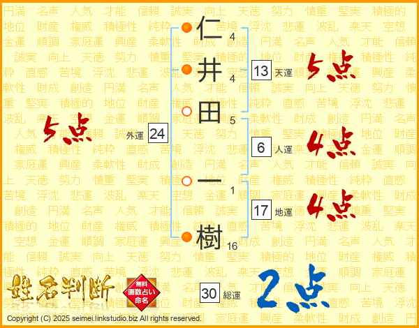 仁井田一樹さんの総運は30画の2点!