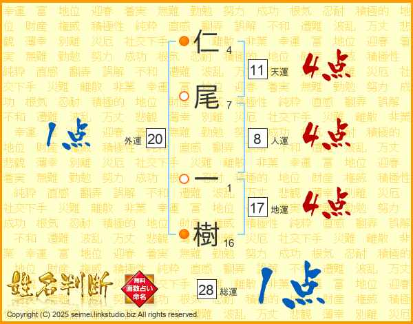 仁(4画)尾(7画) 一(1画)樹(16画)