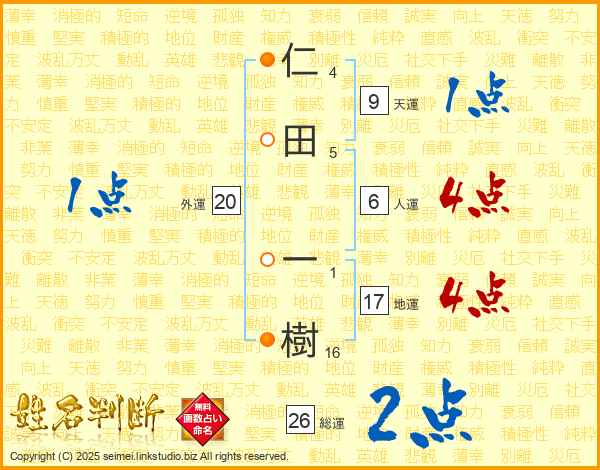 生活面を象徴する運勢です。外部から受ける影響力を表し、結婚運、家庭運や職場、環境への順応性を表します。総運から人運を引いた画数。姓や名が1文字の場合を除く。