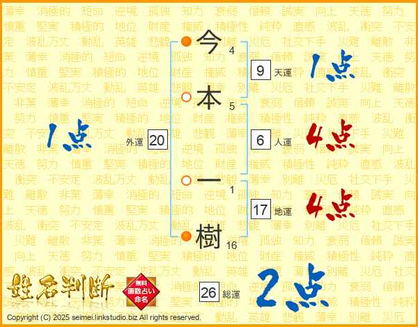 あなたの人生を表す1番重要な運勢です。生涯を通じて影響する総合運となり、主に50歳以降の晩年期に影響を及ぼします。苗字と名前の合計画数。