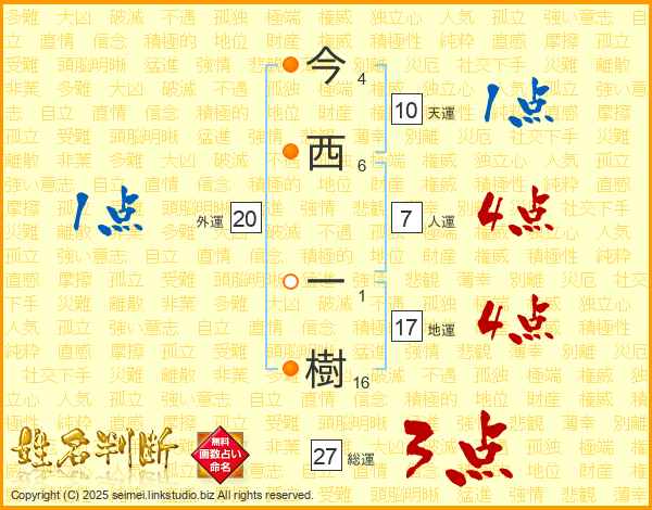 画数の奇数(○陽)と偶数(●陰)の配列で吉凶を占います。どちらかにかたよる名前は大凶名で避ける必要があります。画数の奇数偶数。